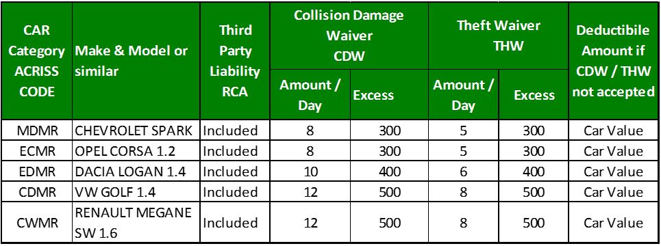 TPL (RCA) – covers you in case you cause damage to someone or something, including passengers and their property, when using rented car. This insurance is included in the rate. Insurance terms of the TPL (RCA) are not valid on the territory of countries that are not mentioned on the vehicle insurance policy (Green card).The renter will pay full value of all damages and losses caused by accidents on that territory.
