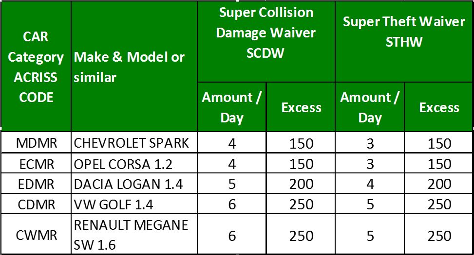 By accepting and paying in addition the Medium Protection Package You can reduce your financial responsibility in case of collision damage and /or theft up to the maximum amount for the selected car group stated in the Excess amounts price list below.